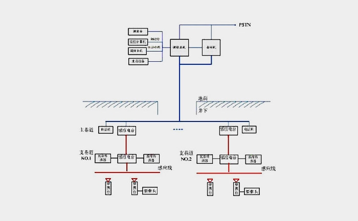 支巷道感應電話機呼叫地面調度時,感應電話機將話音和撥號音變成數字信號調制到400K載波頻點上傳給支巷道與主巷道口安裝的感應電臺上,由感應電臺將接收到的信號解調通過有線傳給調度總機,建立通信。調度呼叫支巷道感應電話時,先通過支巷道與主巷道口安裝的感應電臺,再傳輸給感應電話機,電話機接收到話音建立通信。