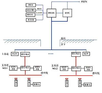 井下與地面通話主要靠調度總機與井下每個支巷道的400KHz感應電臺或主巷道的電話機,它們之間通過電纜或光纖連接,保證系統的用戶量和數據流。井下每個支巷道用戶間的通話采用感應通信,通過敷設在各分支巷道頂部或墻側壁邊的鋼絞線和感應電臺,利用波導感應耦合原理,將感應電臺與感應便攜臺的400KHz信號感應到鋼絞線導線上,400K信號在鋼絞線電纜上有良好的傳送特性,約為每公里衰減了3-5dBu,不受隨道的地形、環境等因素的影響,這樣有利于井下的通信問題。同時感應電臺可以實現話音對講、數據傳輸和圖片傳輸等功能;